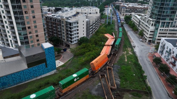 A freight train derailed in downtown Austin early Thursday morning near Third and Bowie streets, with no injuries reported and no hazardous materials involved. Photos show cleanup efforts and road closures.
