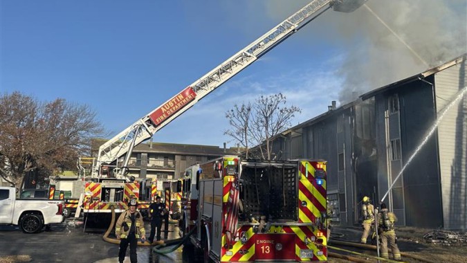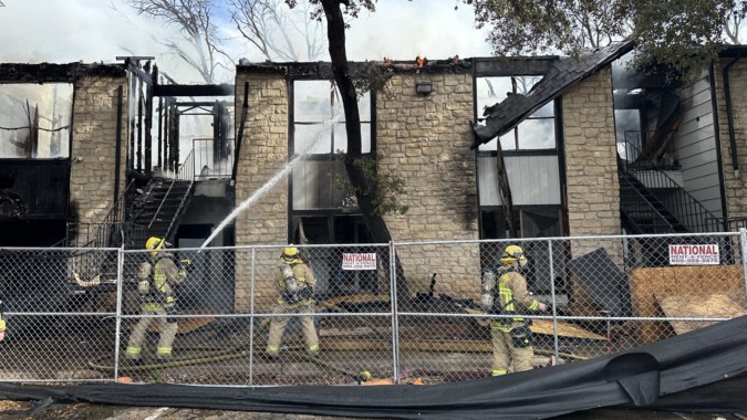 Crews battle a blaze at an abandoned East Austin apartment after a partial collapse; traffic is blocked along Burton Drive.