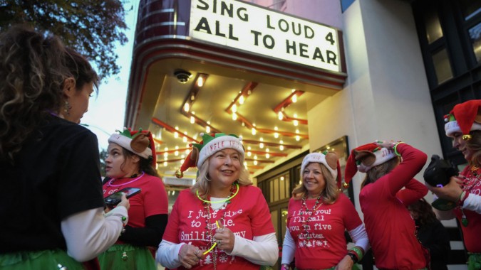 At the Elf Pub Run, participants went from the State Theatre to Scholz Garten for drinks and Elf-themed cheer, then to the Paramount Theatre for a screening.
