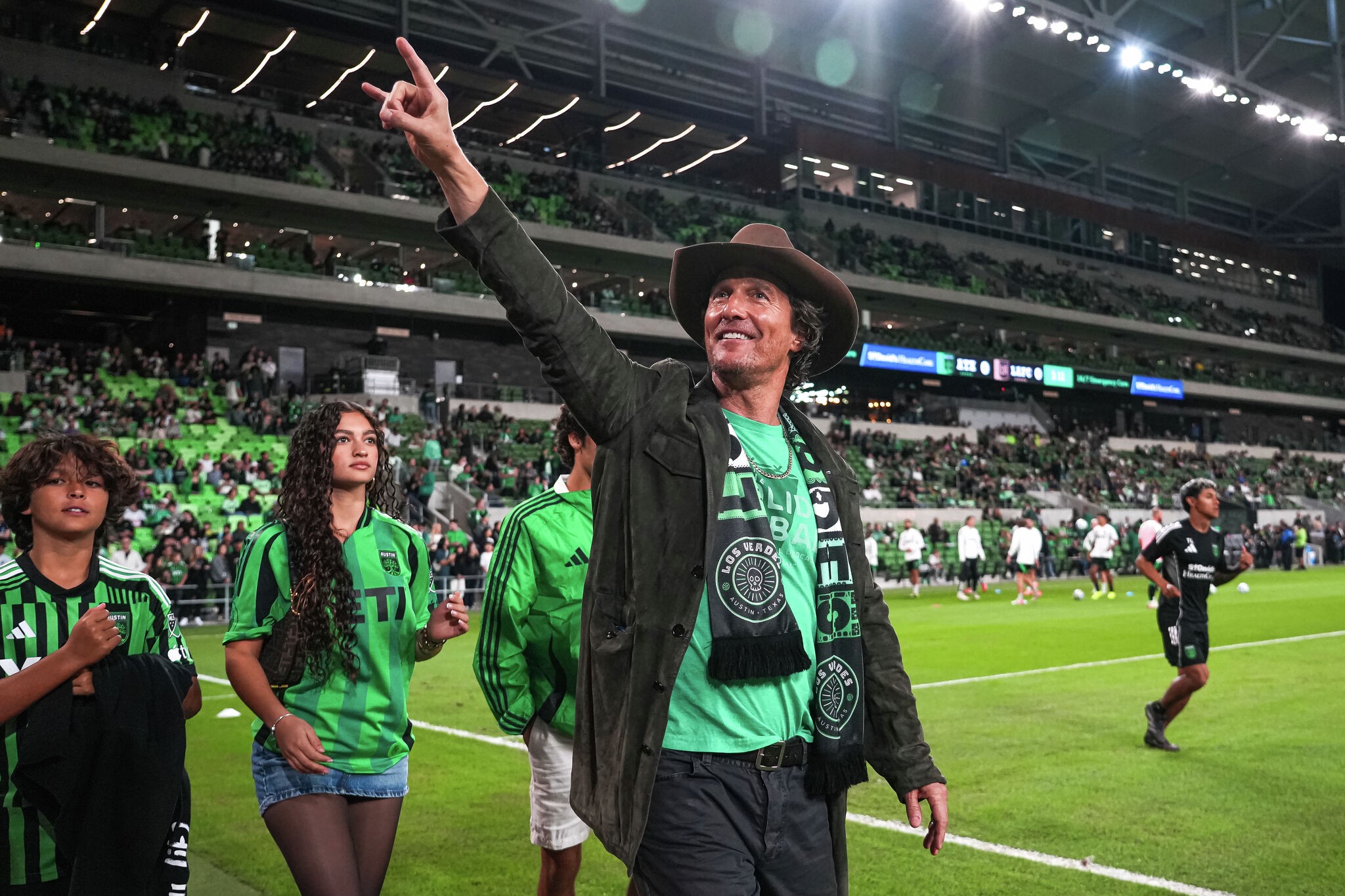 Actor Matthew McConaughey takes the field ahead of the Austin FC MLS playoff match against LAFC at Q2 Stadium on Sunday, Nov. 2, 2025 in Austin.