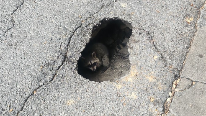 Before workers arrived, several raccoons were spotted poking their heads out of the sinkhole. The road is now patched and reopened.