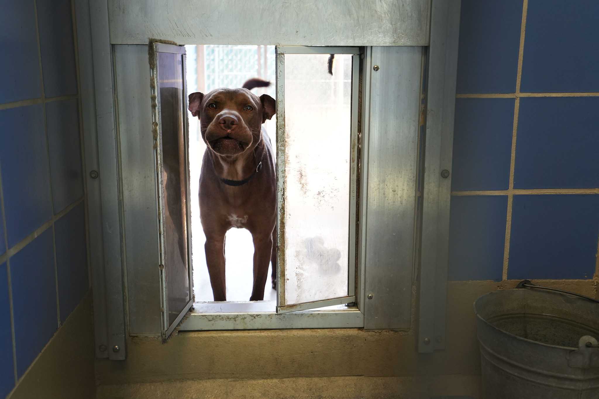 Trap, a mixed mutt, watches Melody Courtney clean kennels at the Austin Animal Center last fall.