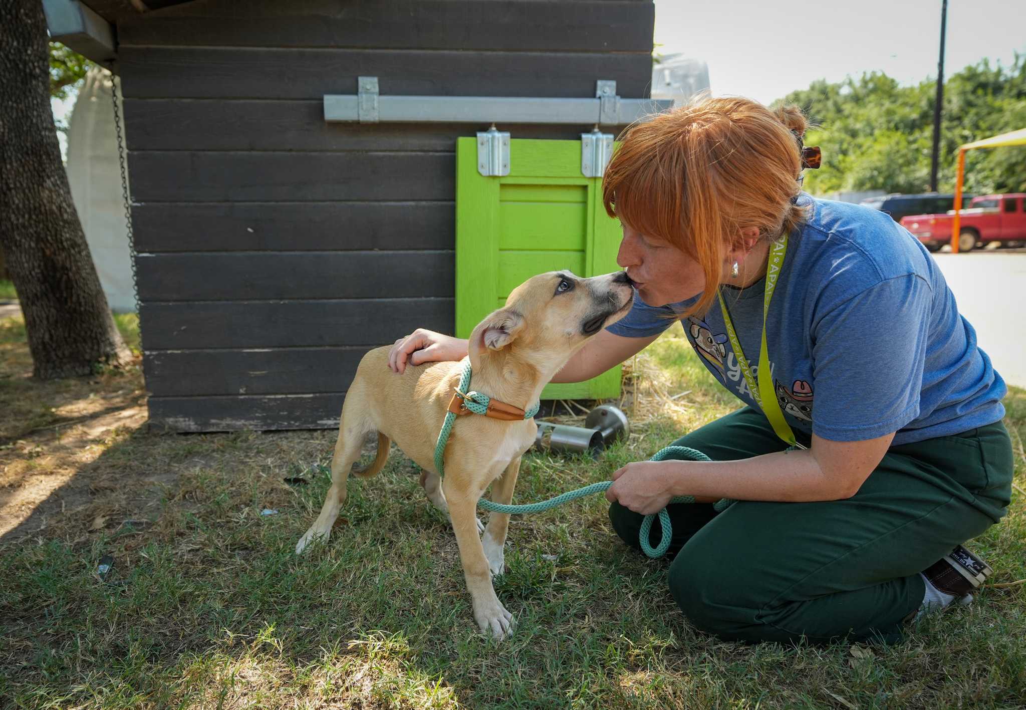 Trinity Surles, Social Media Specialist at Austin Pets Alive, greets Lynette upon its return to the Austin Pets Alive Town Lake Animal Center in Austin, Thursday, Aug. 14, 2025. A man broke into the animal shelter and released several dogs, including Lynette, from their kennels.