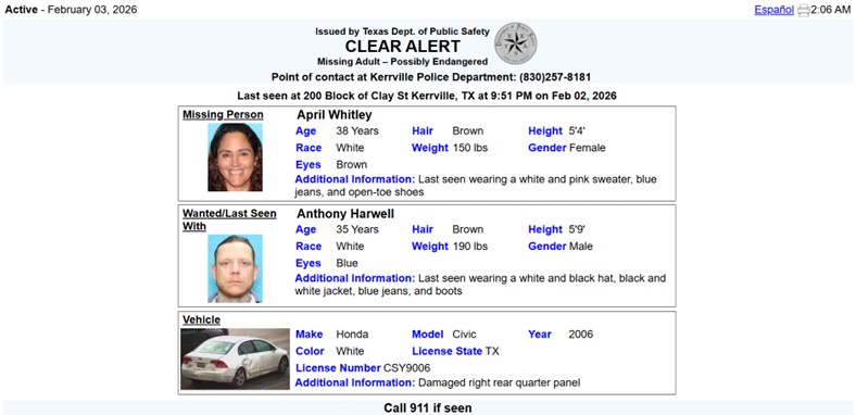 The Texas Department of Public Safety issued a CLEAR Alert early Tuesday for April Whitley, 38, who was last seen just before 10 p.m. Monday in the 200 block of Clay Street in Kerrville. Texas police are seeking the public’s help in finding a woman who went missing from Kerrville Monday night and could be in danger.