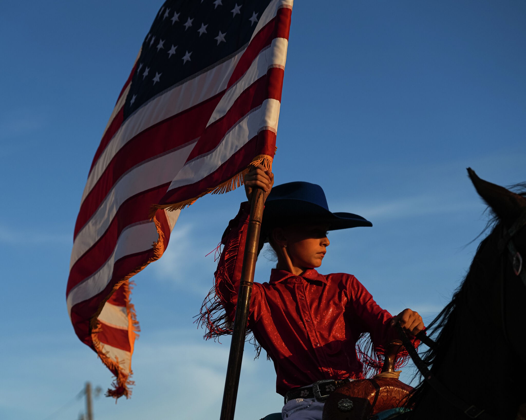 A rider carries the American flag into the arena during the National Anthem at the Marble Falls Rodeo at Charley Taylor Arena on Friday, July 18, 2025 in Marble Falls, Texas.