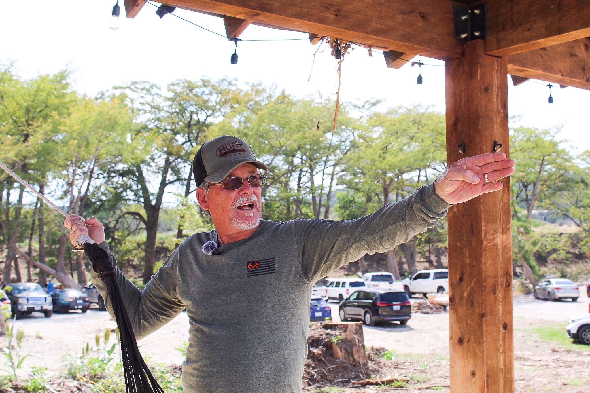 Dan Schoen, owner of the Paradise River Bend wedding venue, which was destroyed in the July 4 flood near the Guadalupe River in Ingram, holds a rope tethered to a support post from the remains of the pavilion. Sidney Orman/Texas State University