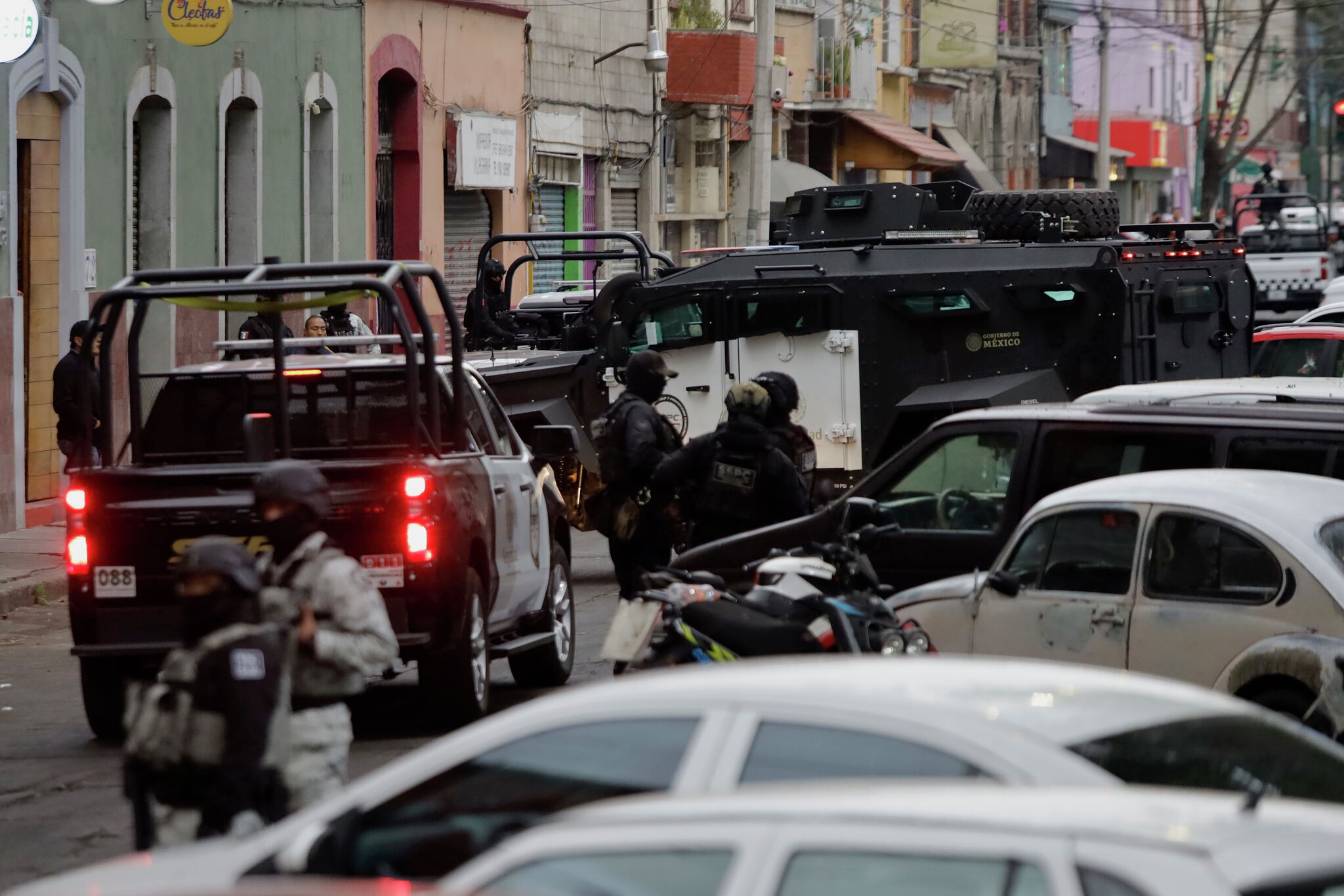 Investigative police officers guard the facilities of the Specialized Prosecutor's Office for Organized Crime of the Attorney General's Office in Mexico City, Mexico, on February 22, 2026, during an operation and the escort of a Rhino, an armored tactical vehicle used for high-impact operations and critical security situations, following the death of Nemesio Oseguera Cervantes ''El Mencho,'' leader of the Jalisco New Generation Cartel, by federal forces. (Photo by Gerardo Vieyra/NurPhoto via Getty Images)