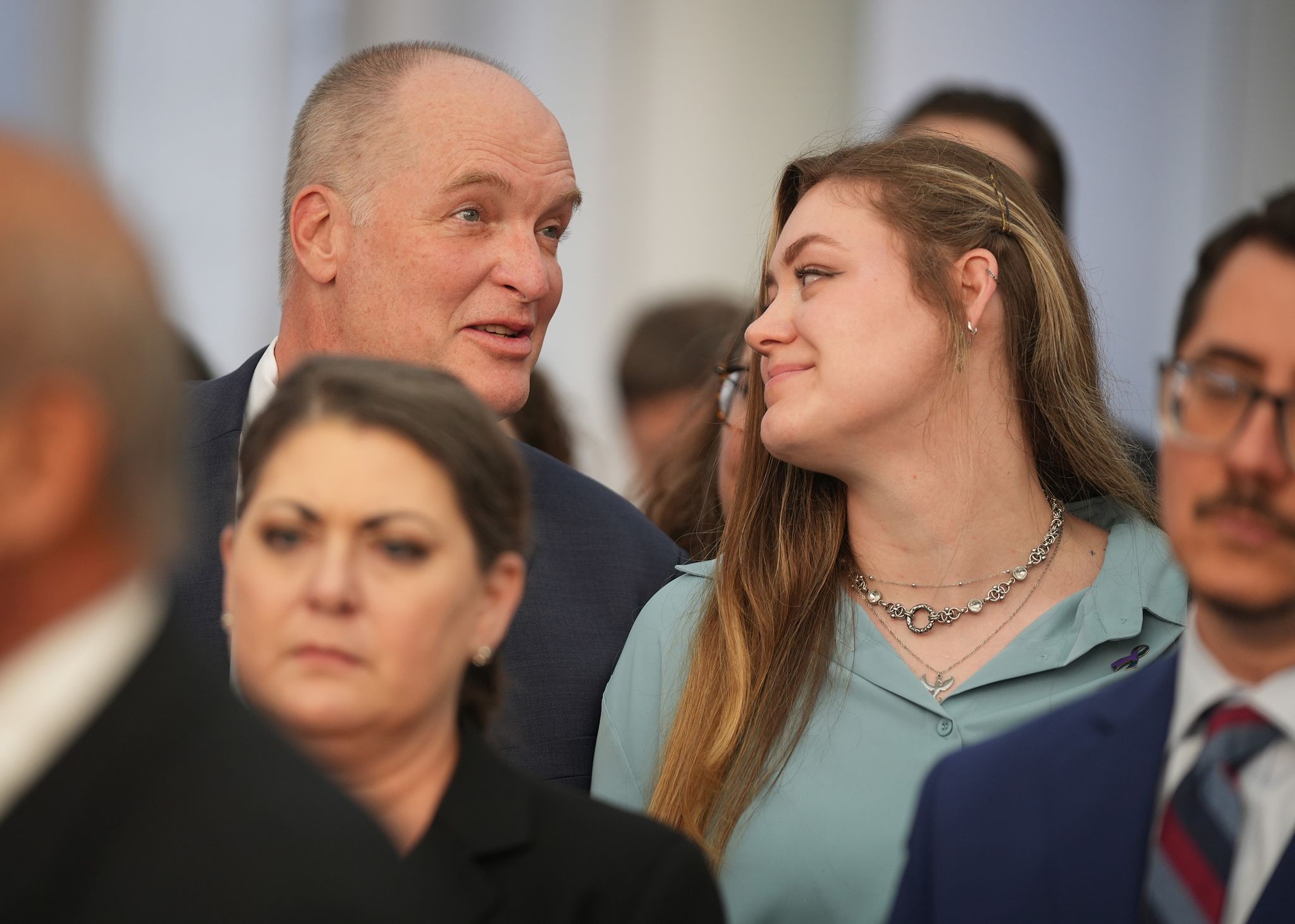 Michael Scott and his daughter Jazmine Scott listen to a news conference after he was exonerated at a hearing for four men wrongfully accused in the 1991 Austin yogurt shop murders at the Blackwell-Thurman Criminal Justice Center in Austin on Thursday, Feb. 19, 2026. Forrest Welborn, Michael Scott, Robert Springsteen and Maurice Pierce, who is deceased, were declared actually innocent during the hearing. Jay Janner/Austin American-Statesman