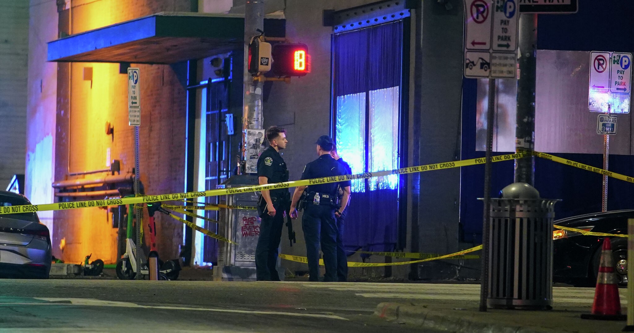 An Austin police officer guards the scene on West 6th Street at West Avenue after a shooting on Sunday, March 1, 2026.