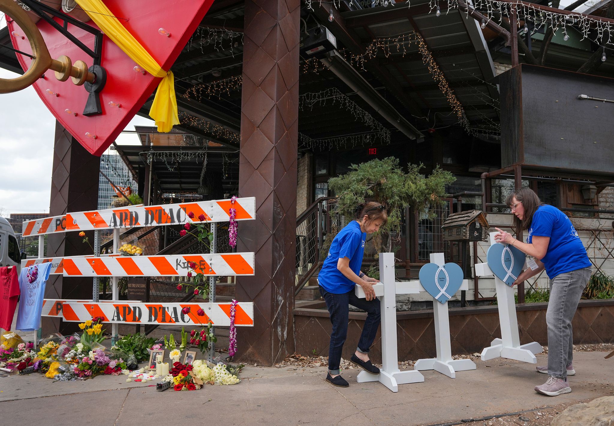 Sylvia Alkis, left, and Susan Crum, volunteers with Lutheran Church Charities, place three wooden crosses at a growing memorial for the victims of the mass shooting outside Buford’s Backyard Beer Garden in Austin on Thursday, March 5, 2026. Three people were killed in the shooting early Sunday. The gunman also died.