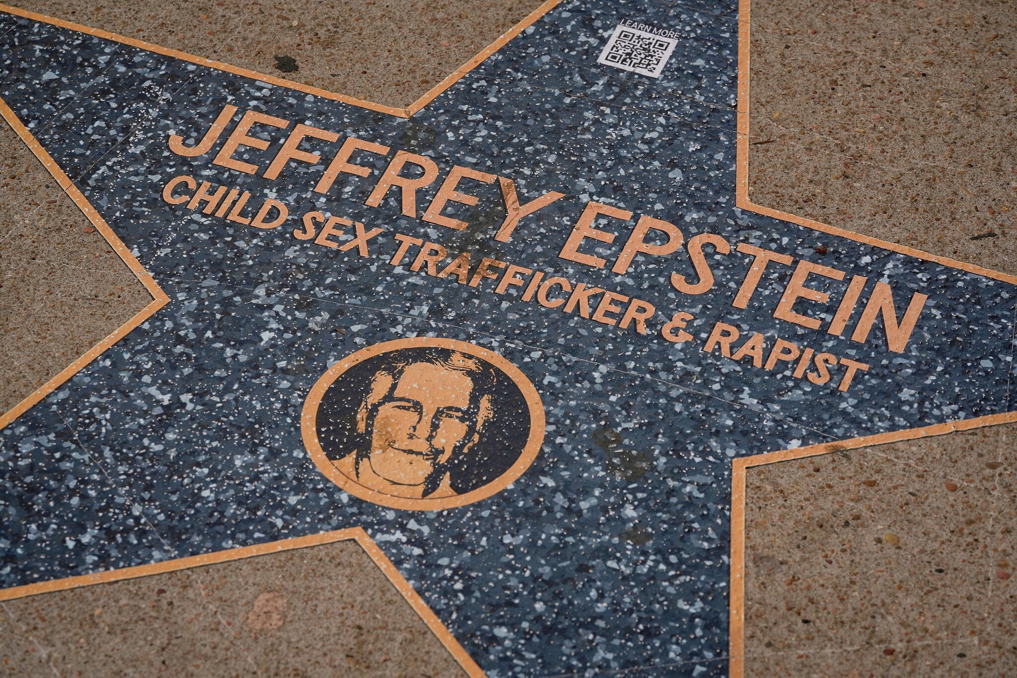 An anonymous "Jeffrey Epstein Walk of Shame" installation appeared on Brazos Street in Austin during SXSW, featuring stars naming public figures with QR codes linking to case documents.