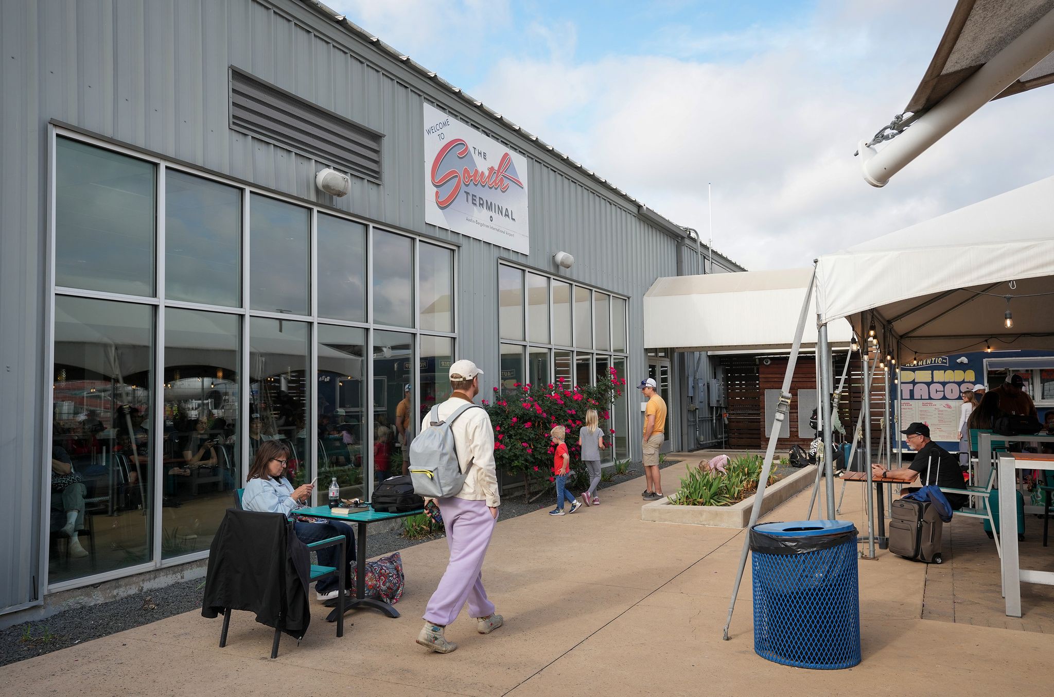 Passengers sit and walk on an outdoor patio at the South Terminal at Austin-Bergstrom International Airport in Austin on Monday, March 30, 2026. The terminal is scheduled to close March 31, with flights moving to the Barbara Jordan Terminal as part of an airport expansion project.