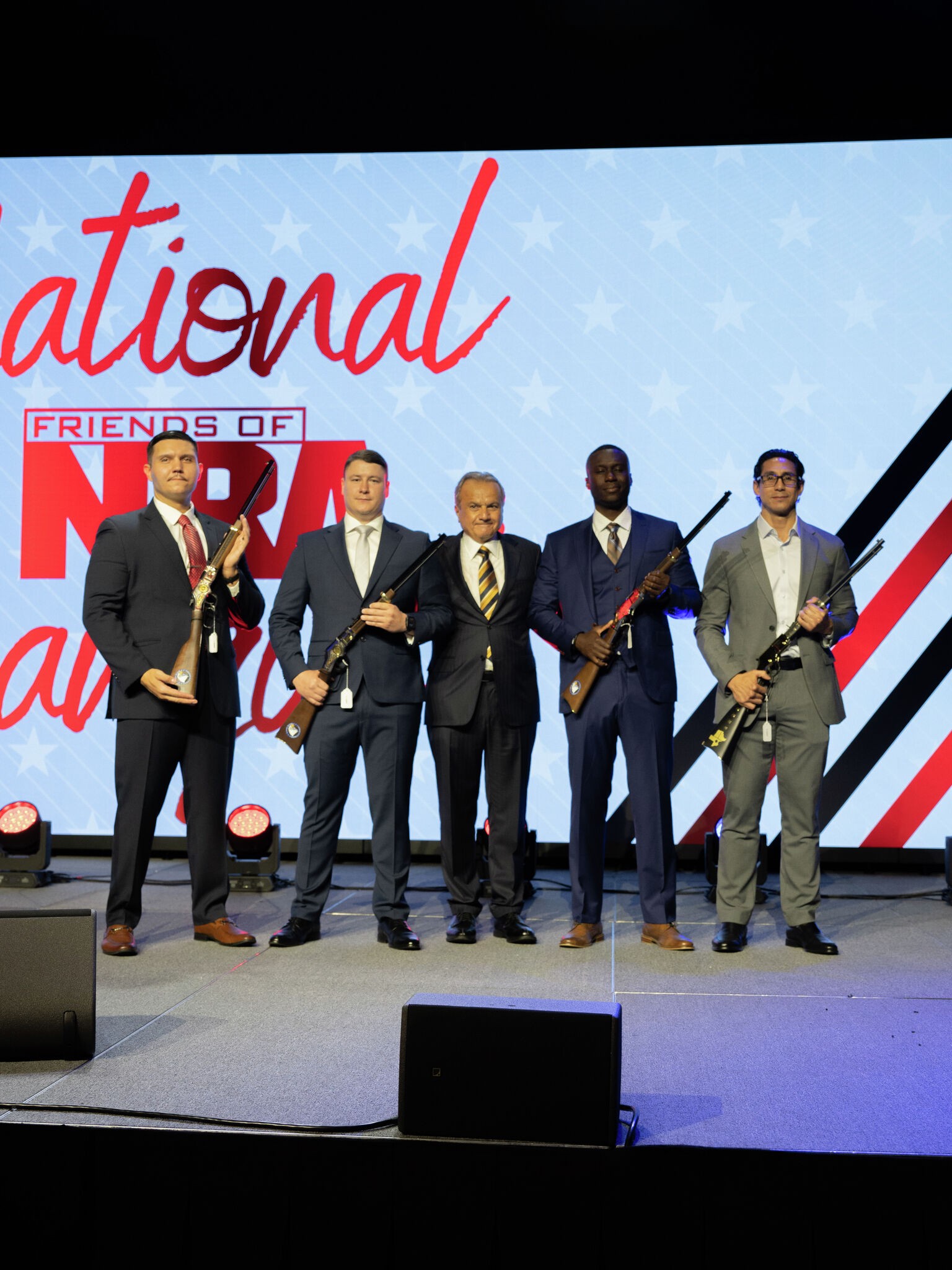 Henry Repeating Arms Founder and CEO Anthony Imperato stands with three Austin Police Department officers honored for their actions in stopping the Sixth Street mass shooter in Austin last month, along with Pasadena hero Juan Lopez, during a special presentation at the National Friends of NRA Event in Houston on Friday, April 17, 2026.
