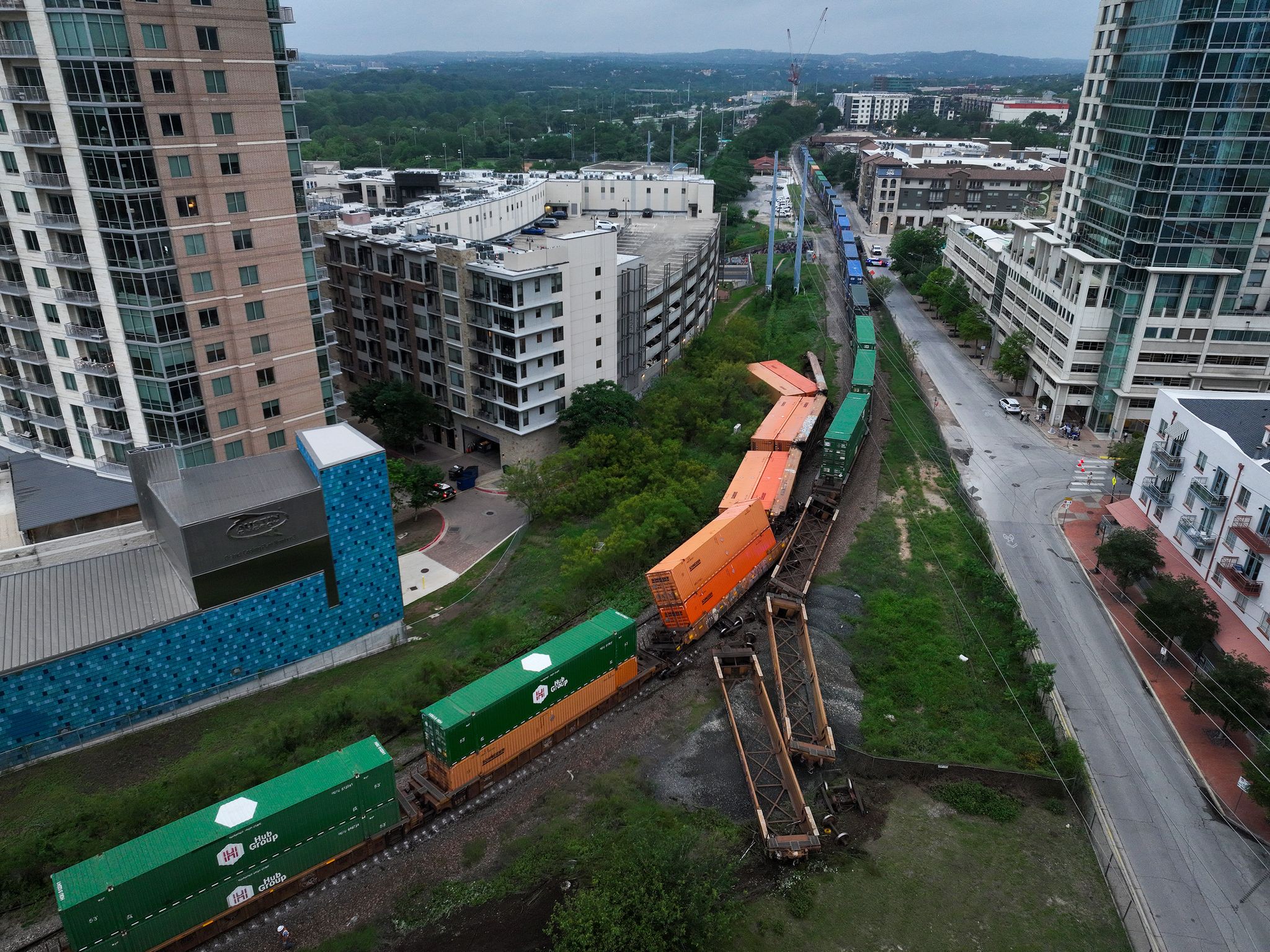 A freight train derailed in downtown Austin early Thursday morning near Third and Bowie streets, with no injuries reported and no hazardous materials involved. Photos show cleanup efforts and road closures.