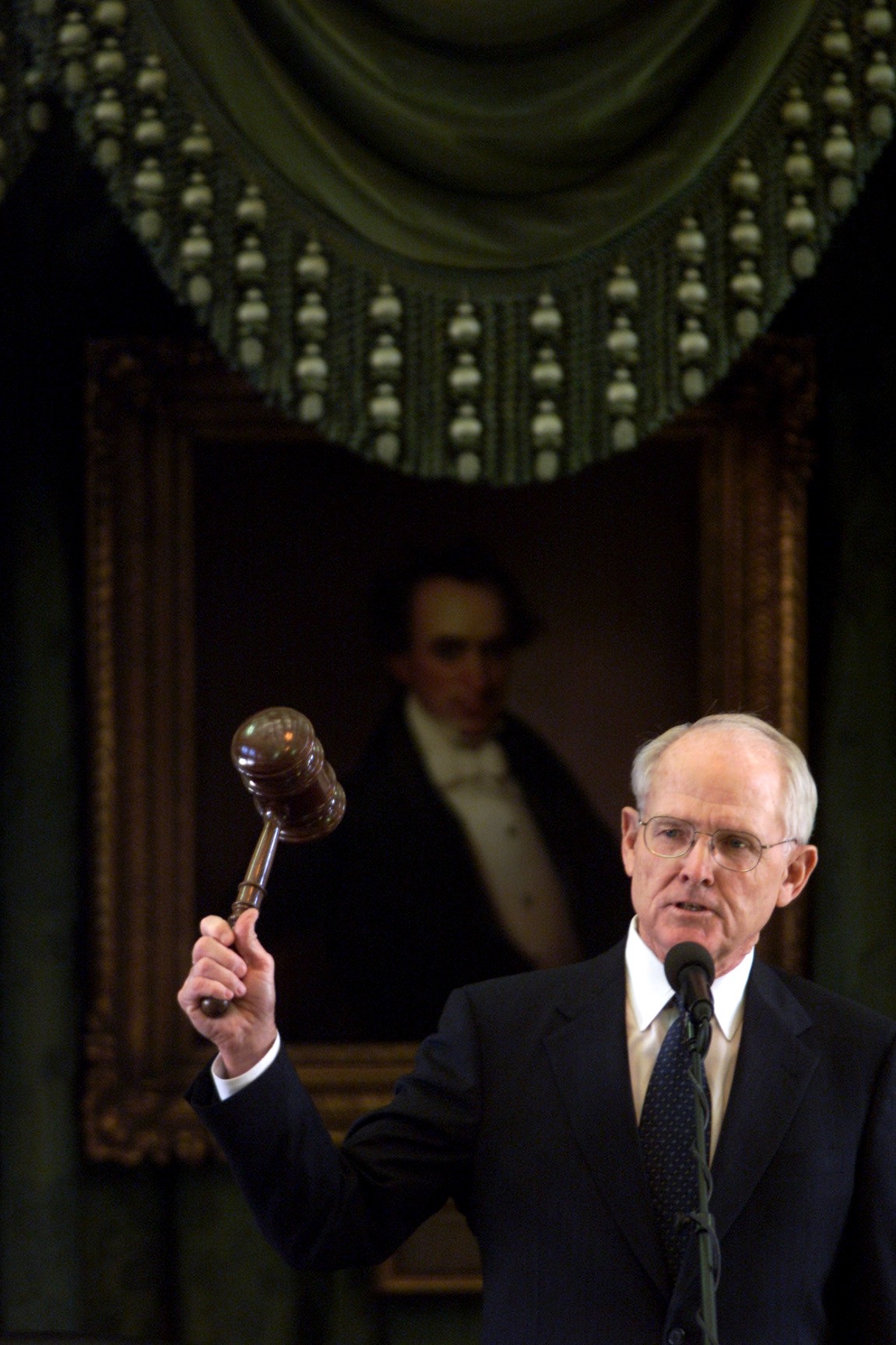 Lt. Gov. Bill Ratliff wields the gavel in the Texas Senate on the first day of the 77th legislative session at the Capitol in Austin on Jan. 9, 2001.
