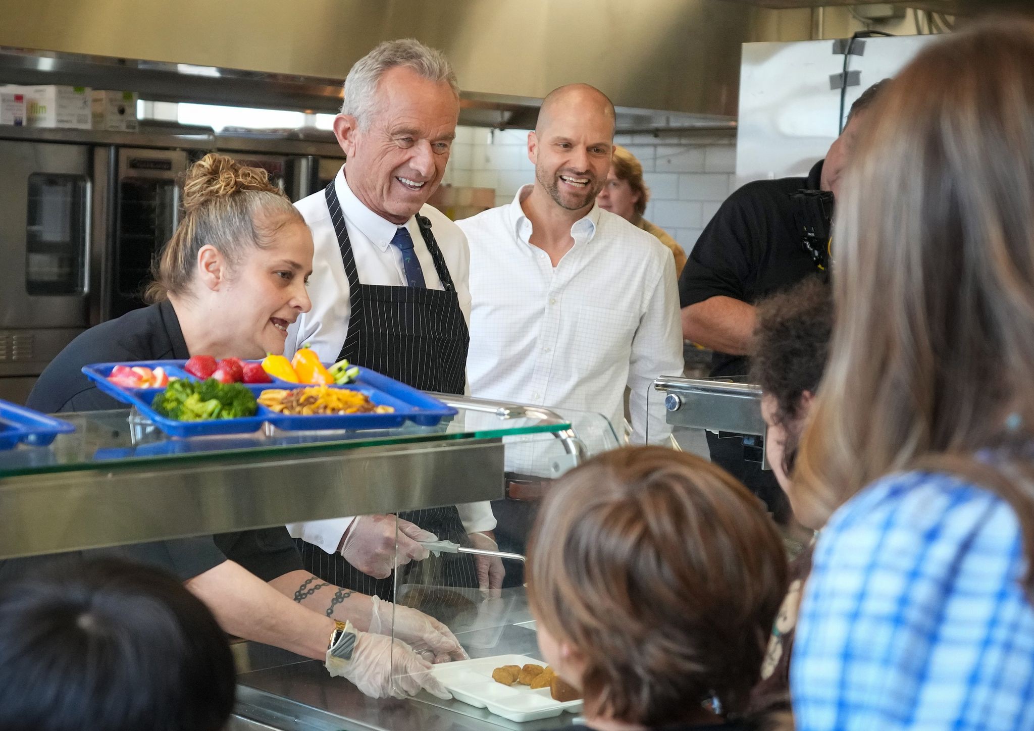 U.S. Health and Human Services Secretary Robert F. Kennedy Jr. puts on his apron before helping to serve lunch during a tour of the kitchen at Cunningham Elementary School in Austin on Friday, Feb. 27, 2026. Kennedy visited the campus to discuss federal dietary guidelines and nutrition policy.
