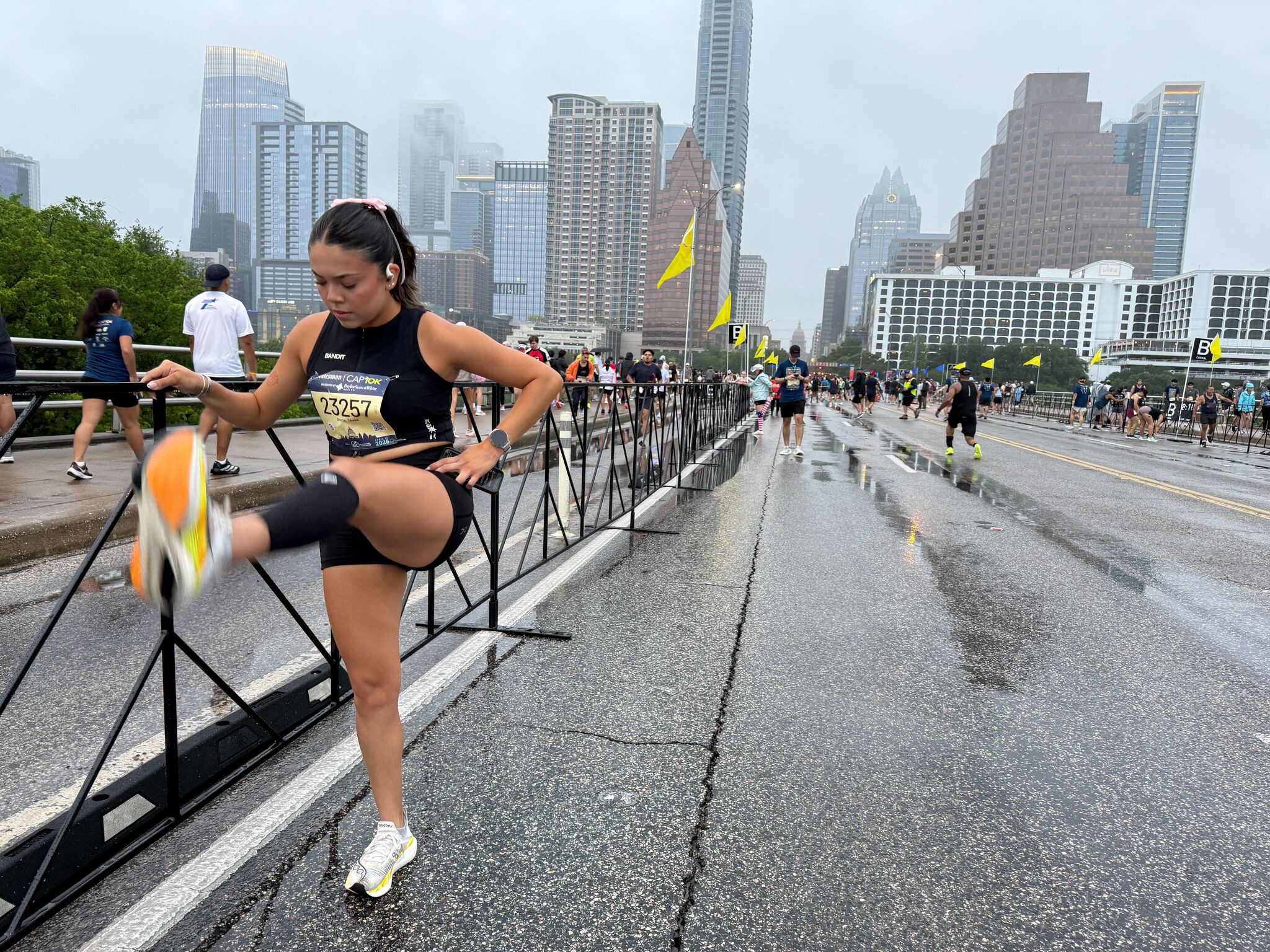 Runners took shelter nearby while awaiting their corral start times. Karla Bradford warmed up before the race, as captured in a photo by Ricardo B. Barzziell/Austin American-Statesman. Additional coverage included images by Jay Janner/Austin American-Statesman showing participants preparing and seeking shelter at the Embassy Suites.